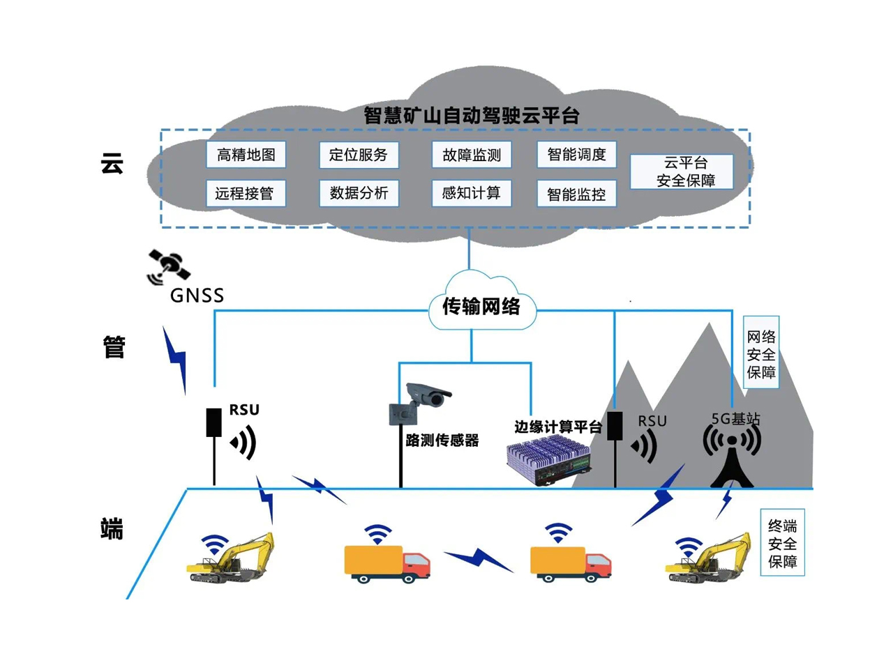 無人駕駛礦卡作業場景通過在重型礦用卡車加裝激光雷達、毫米波雷達、高清攝像頭、差分GPS定位、車載計算平臺等數據采集終端和車輛控制終端,輔以北斗/GPS高精定位系統,通過車與車、車與調度中心間5G實時通訊,基于礦區三維建模數據、實時路測數據、邊緣計算能力和無人駕駛調度系統算法,實現重型礦車的路徑規劃、精準停靠、自動裝卸、停車避讓、遠程操控等作業任務。